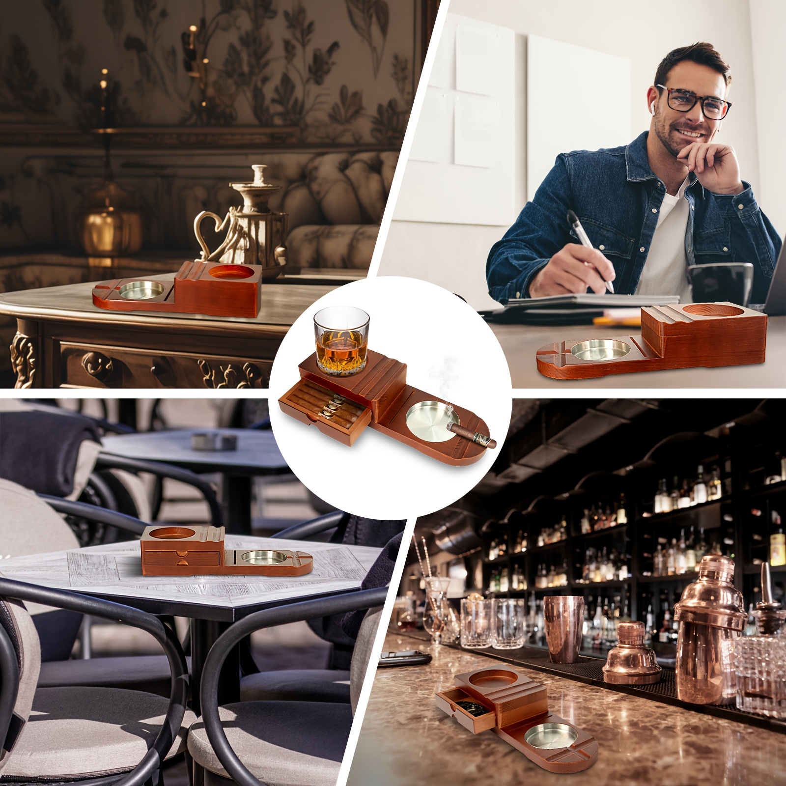 4 In 1 Cigar Humidor and Cigar Ashtray Set, Cigar Accessories with Ashtray, Drawers, Cigar Trough, Cigar Cutter Trough, Can Place Wine Glasses, Cigar Clippers, Wooden Tray, Ashtray, Cigar Accessories Kit for Men Luxury, Cigar